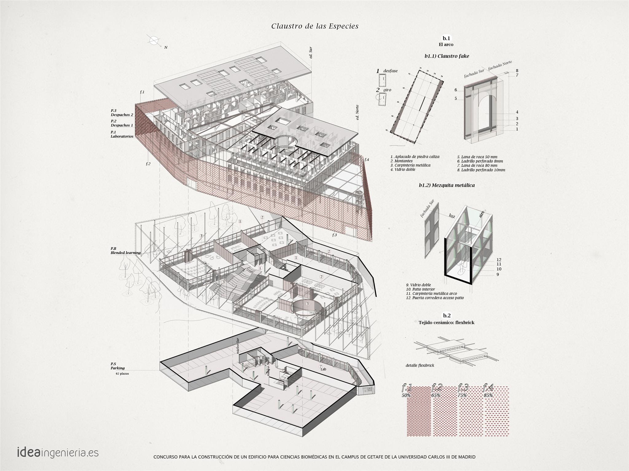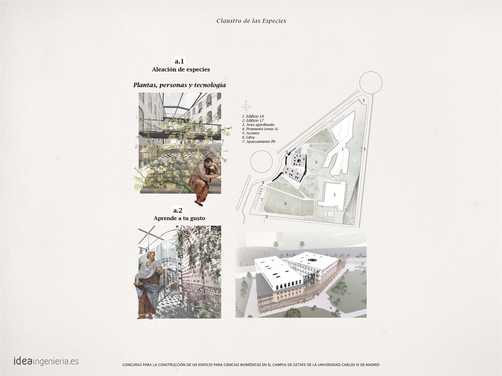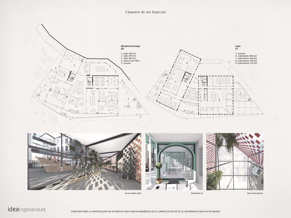 L’équipe d’IDEA Arquitectura présente un nouveau projet, le « Cloître des Espèces », une nouvelle création pour le concours d’architecture de l’Université Carlos III de Madrid. IDEA a développé un projet pour un concours organisé par l’Université Carlos III en collaboration avec le Collège officiel des architectes de Madrid, pour la construction d’un bâtiment destiné aux sciences biomédicales sur le campus de Getafe à Madrid.