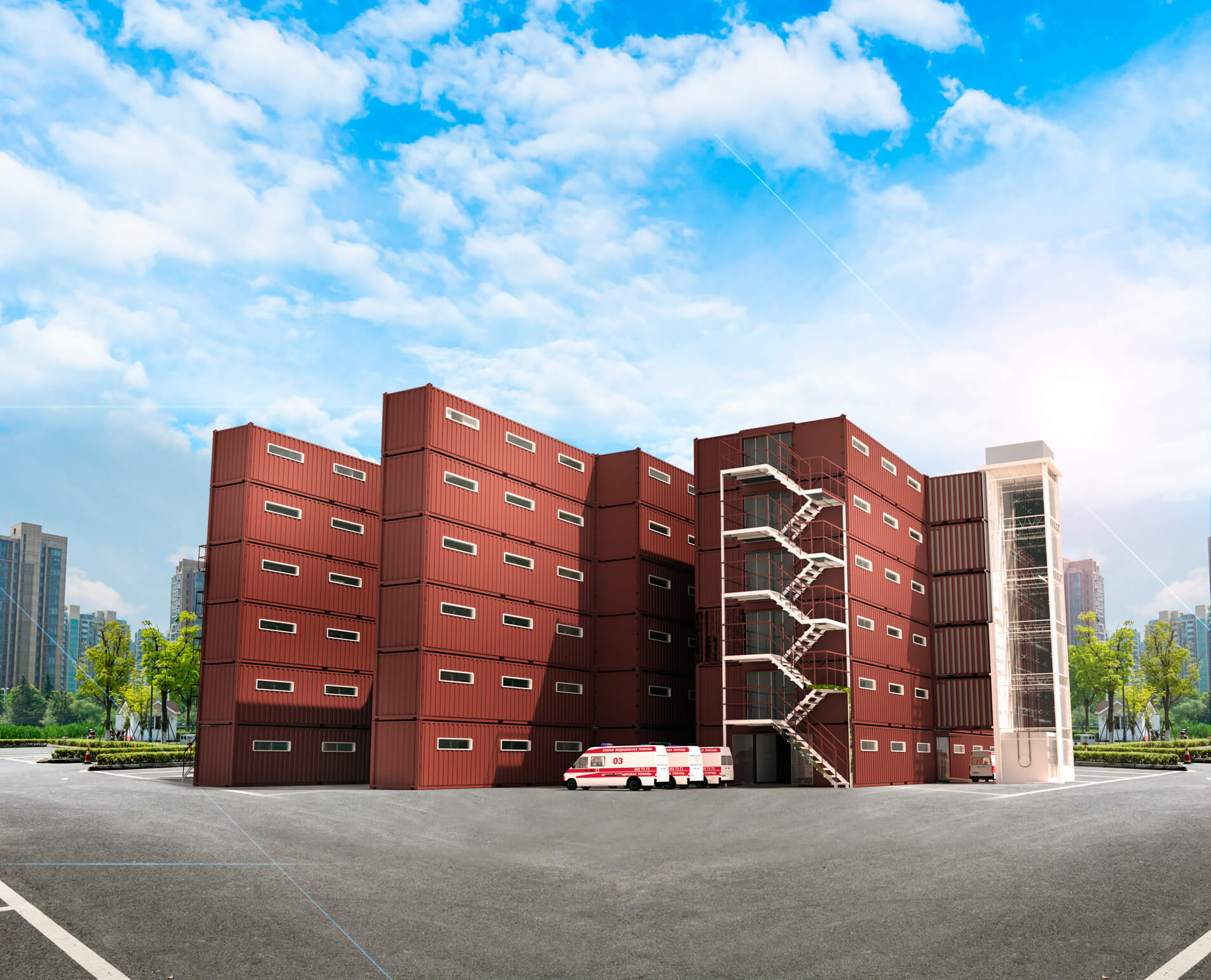 Usando el mismo principio de la construcción modular, IDEA propone el uso de contenedores marítimos para poder generar estructuras sólidas de hasta 6 o 12 alturas. Estamos ante un nuevo modelo de hospital prefabricado u hospital de campaña capaz de hacerle frente a esta crisis sanitaria.