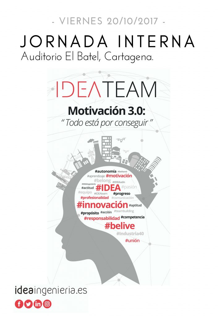 IDEA Team, Motivación 3.0, dará comienzo el próximo 20 de Octubre, a través de una jornada corporativa que se abrirá mediante un acto interno de la empresa, y a continuación una serie de actividades de marca personal, dinámicas de grupo y actividades de team building específicas, en las que se trabajarán conceptos como la Triple A: Aptitud, Actitud y Acción, muy presentes en el ADN de la joven ingeniería murciana. La motivación, la pasión, la unión y el reconocimiento tanto personal como profesional de los empleados , son algunas de las premisas que IDEA lleva gestionando desde sus comienzos, teniendo como resultado un mejor ambiente laboral, una comunicación más eficaz y un gran sentido de pertenencia y espíritu de equipo.