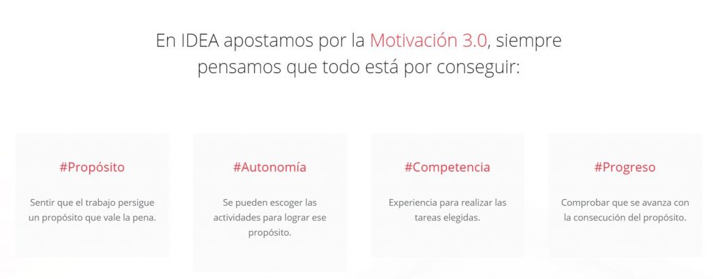 IDEA Team parte del concepto de Motivación 3.0, “todo está por conseguir”, bajo cuatro premisas básicas e imprescindibles que harán logremos nuestros objetivos: propósito, autonomía, competencia y progreso.